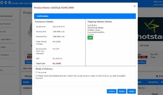 BSNL subscribers can visit the BOSS Online website to view available device bundle offerings. The subscriber can select the product / device and schedule the required FTTH / broadband / landline number and pay the required advanced annual plan fees + the combined fee online. Once payment is received, the plan change will be initiated in the respective BSNL billing system and the designated messaging partner will ship the device.